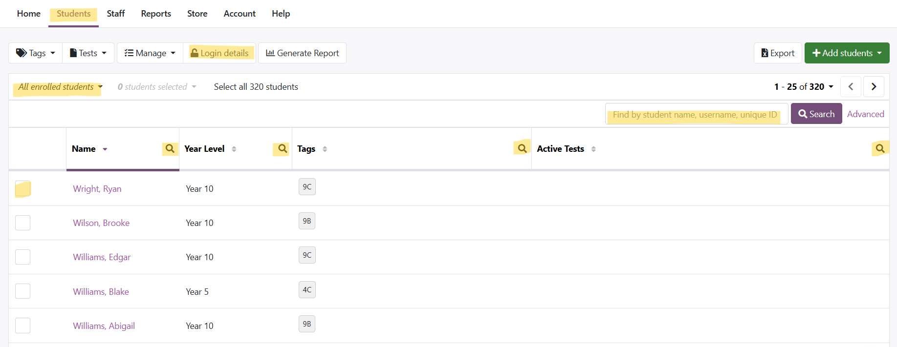 This page displays students who have been added to the account and who are marked as being enrolled at your school. Previously enrolled students who remain in your account can also be found here. In addition to the students' names, the table shows their year levels and any currently assigned tags or tests.