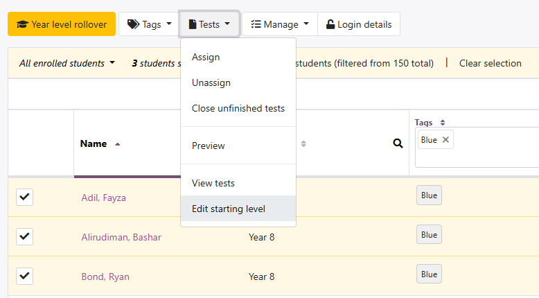To edit students' starting levels in bulk: