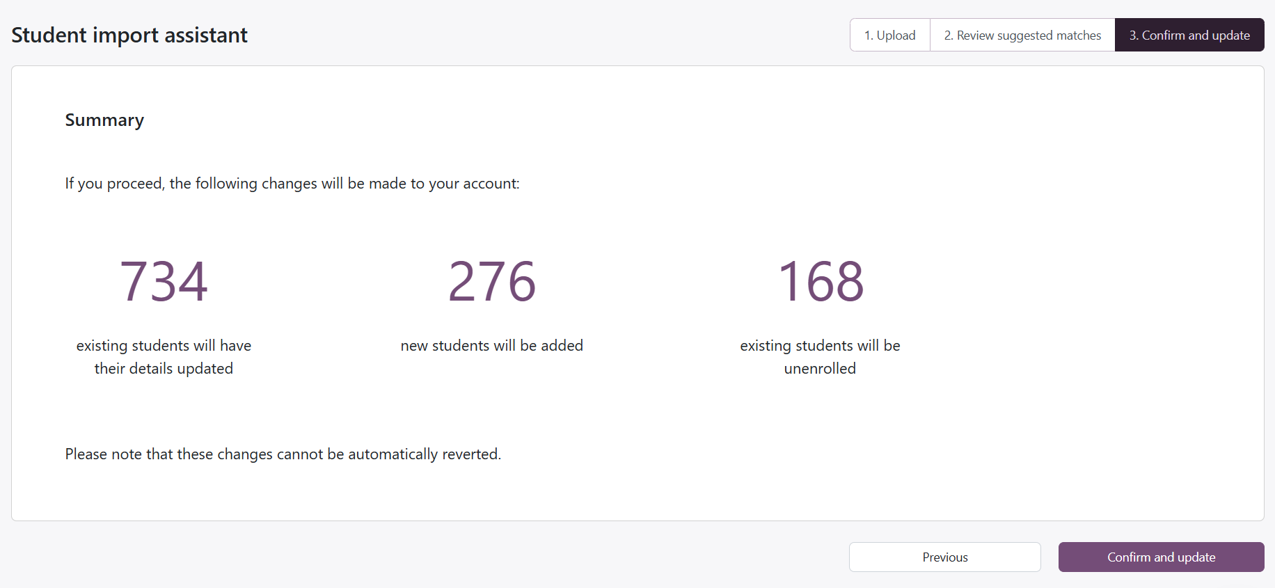 On the final page of the student import assistant, you will be presented with a summary of the changes that will take effect if you decide to continue. Before proceeding, check that these numbers match what you expect to happen. You may click Previous to return to earlier steps and make any required changes.