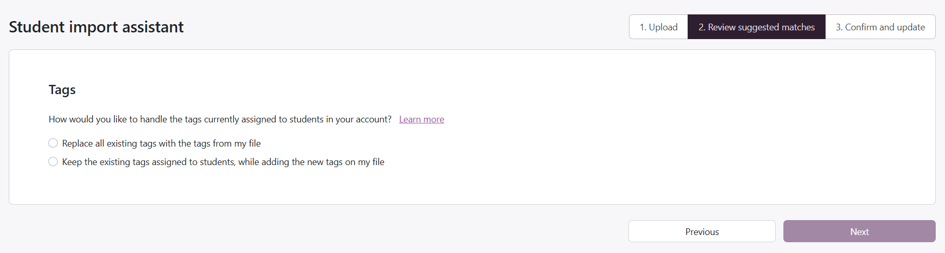 After reviewing all strong and weak matches, you will be asked how you want the system to update tags for students in your account. You have two options: