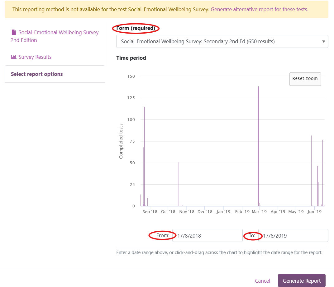 - The Time period will pre-fill with dates where surveys have been completed. This can be changed in the From and To date boxes.