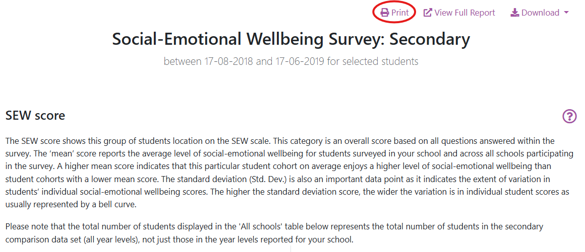 the entire report including results for all Aspects and all individual survey items. To print the entire report, or