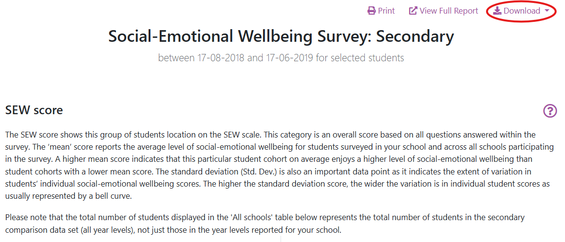 An Excel spreadsheet containing the levels of Agreement for each individual survey item can be downloaded by selecting the Download icon at the top of the report.